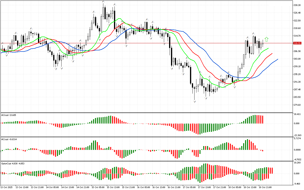 O indicador Alligator confirma o sentimento positivo do mercado. A “boca do Alligator” está aberta e com fome. Nesse contexto, o preço pode continuar a subir.