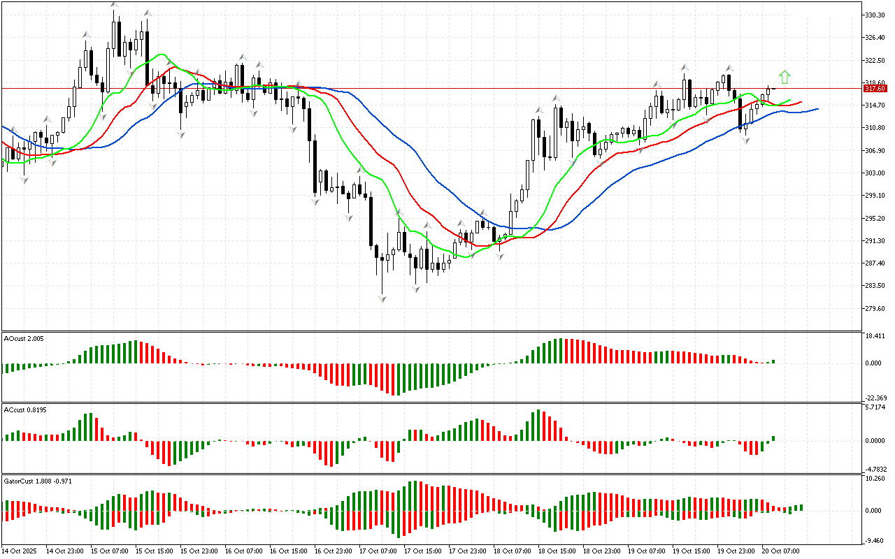 A última barra formada nos indicadores AO, AC e Gator tem a cor verde. Esse sinal pode indicar um fortalecimento do sentimento positivo do mercado. Os traders podem considerar isso como uma confirmação do atual movimento de alta e avaliar opções para abrir ou aumentar posições compradas.