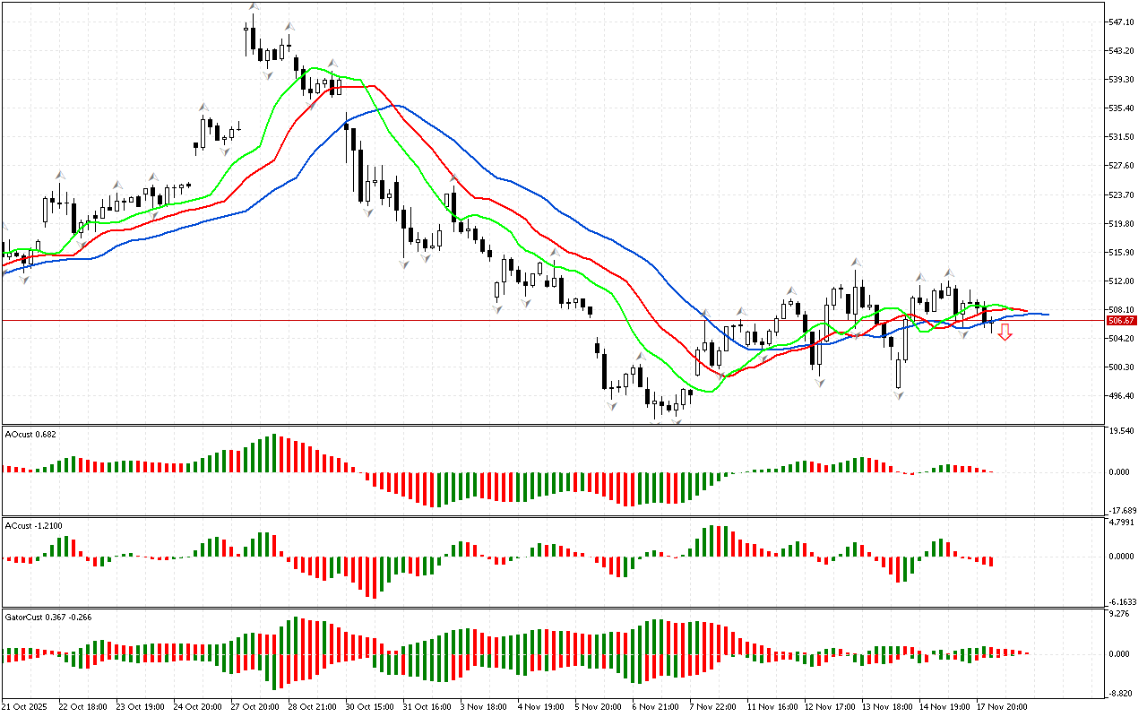 As duas barras vermelhas localizadas abaixo da linha zero no indicador Accelerator Oscillator mostram um aumento de energia na fase de baixa do mercado.