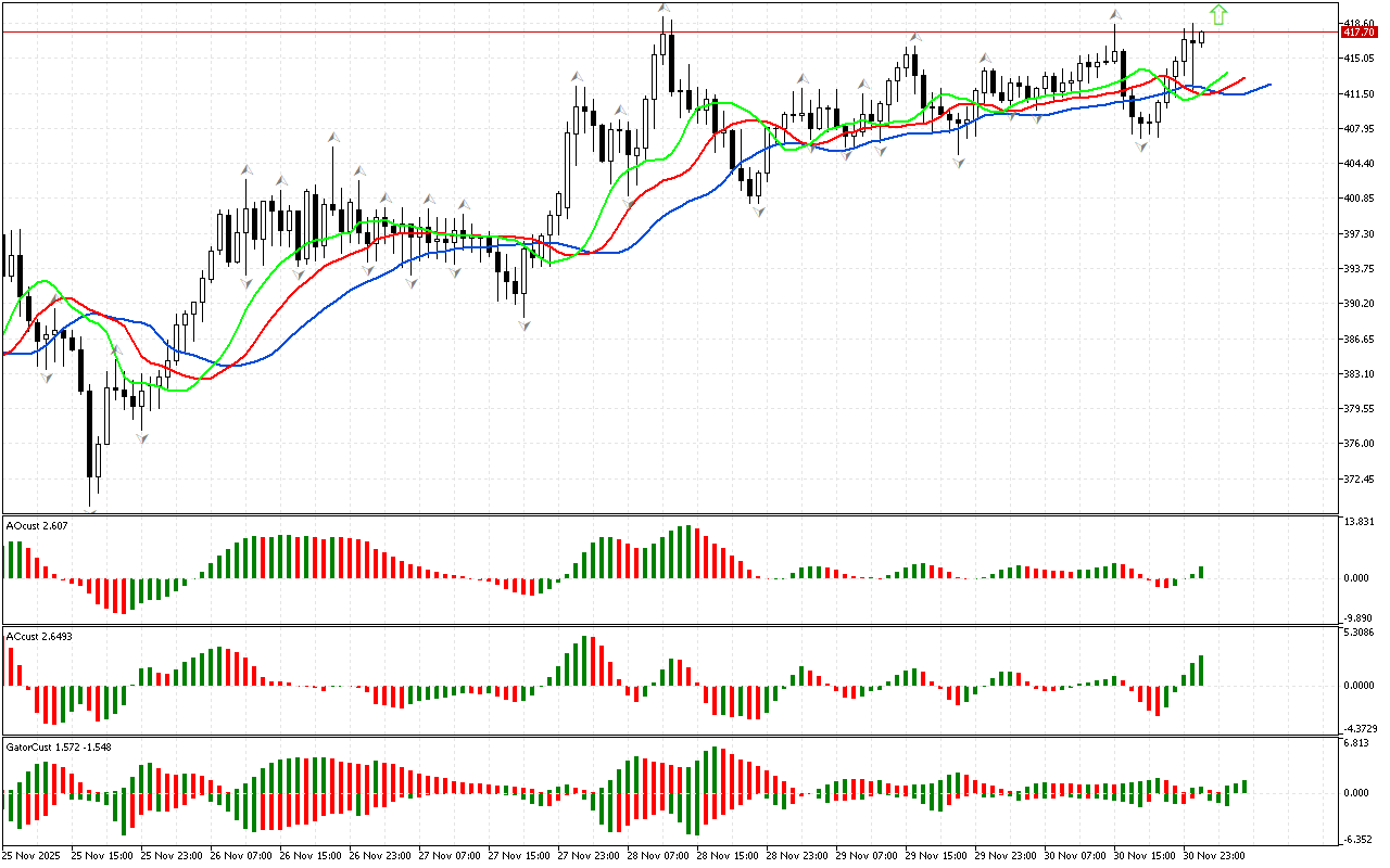 A última barra formada nos indicadores AO, AC e Gator tem a cor verde. Esse sinal pode indicar um fortalecimento do sentimento positivo do mercado. Os traders podem considerar isso como uma confirmação do atual movimento de alta e avaliar opções para abrir ou aumentar posições compradas.