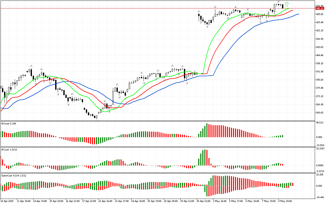 O indicador Alligator confirma o sentimento positivo do mercado. A “boca do Alligator” está aberta e com fome. Nesse contexto, o preço pode continuar a subir.