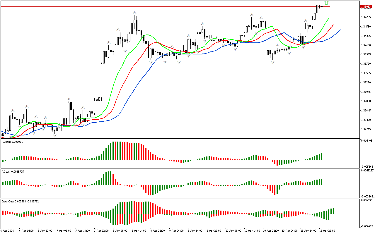 Várias colunas verdes em sequência foram formadas no indicador Gator. Isso indica que o Alligator está com fome e seu apetite está aumentando.