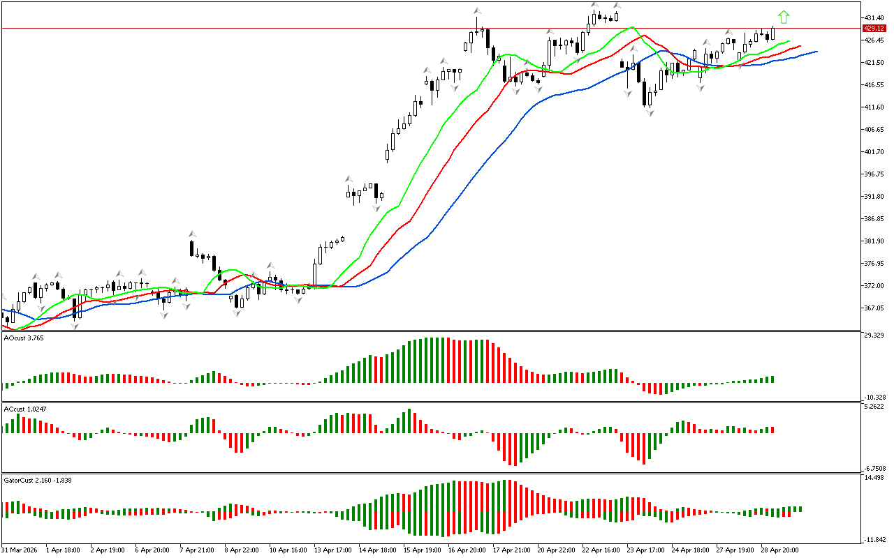 O indicador Alligator confirma o sentimento positivo do mercado. A “boca do Alligator” está aberta e com fome. Nesse contexto, o preço pode continuar a subir.