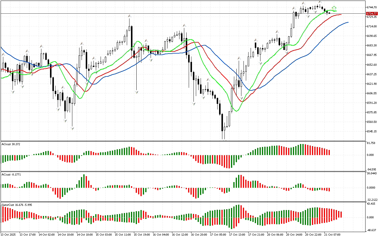 Ταυτόχρονα, οι ενδείξεις AC και AO έγιναν κόκκινες. Αυτό σηματοδοτεί ότι η δύναμη και η ενέργεια της ανοδικής ώθησης έχουν επιβράδυνση. Αυτό μπορεί να οδηγήσει στην ανάπτυξη βαθύτερης διόρθωσης ή αλλαγής τάσης. Ωστόσο, το σενάριο της βόρειας κίνησης παραμένει κυρίαρχο όσο η τιμή παραμένει πάνω από την κόκκινη γραμμή Alligator.