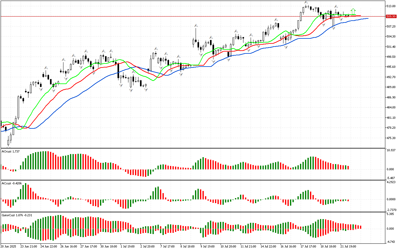 Ο δείκτης Alligator επιβεβαιώνει τη θετική διάθεση της αγοράς. Το στόμα του αλιγάτορα είναι ανοιχτό. Είναι πεινασμένο. Σε αυτό το πλαίσιο, η τιμή μπορεί να συνεχίσει να αυξάνεται.