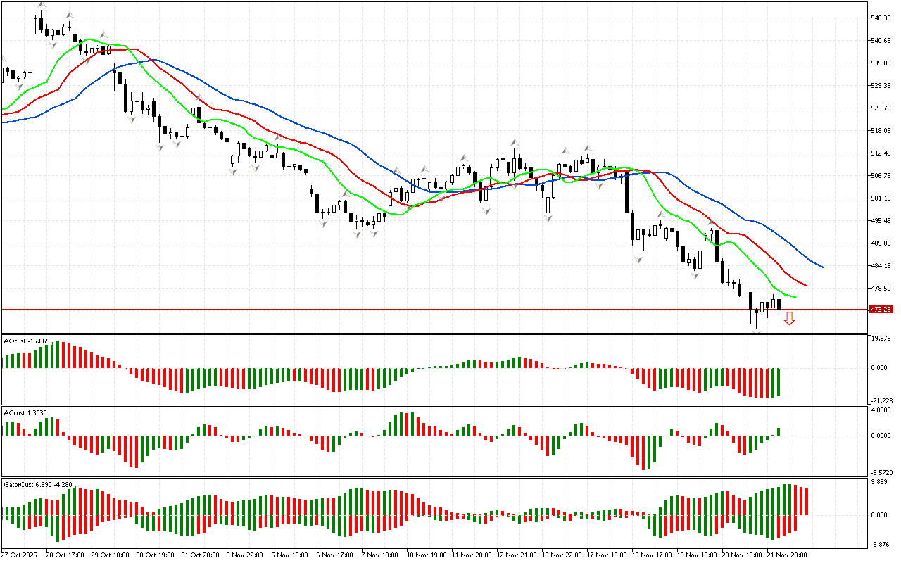 Οι τελευταίες ράβδοι στα γραφήματα AC και AO είναι πράσινες. Οι δείκτες σηματοδοτούν ότι η δύναμη και η ενέργεια της νότιας ώθησης παρουσιάζουν επιβράδυνση. Μπορεί να είναι είτε μια αντιστροφή της τοπικής τάσης είτε ένα μήνυμα για την ανάπτυξη μιας διόρθωσης. Ωστόσο, ενώ η τιμή είναι κάτω από τον δείκτη Alligator, η κίνηση προς τη νότια κατεύθυνση παραμένει διαδεδομένη.