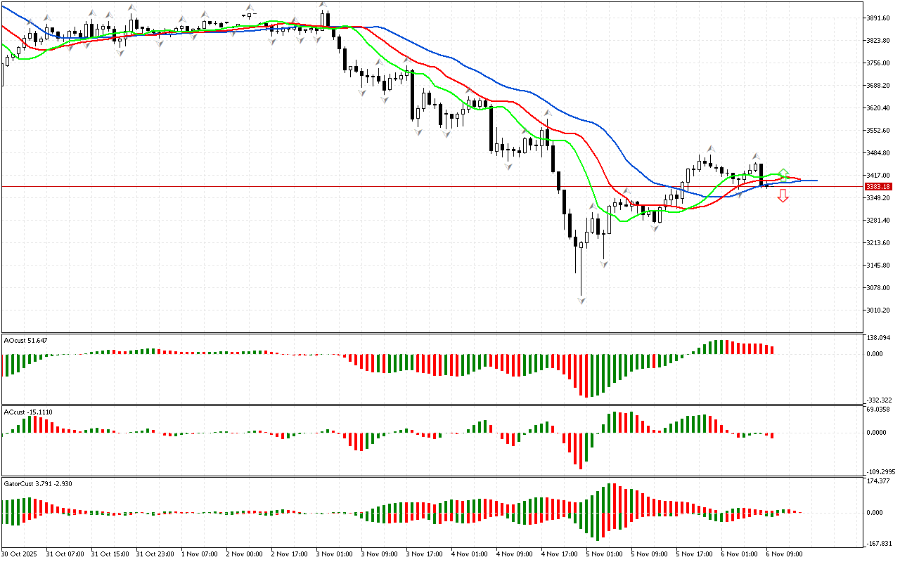 The histogram of the Gator indicator has not formed a clear signal yet. The color of the histograms changes, indicating a change in market phase.