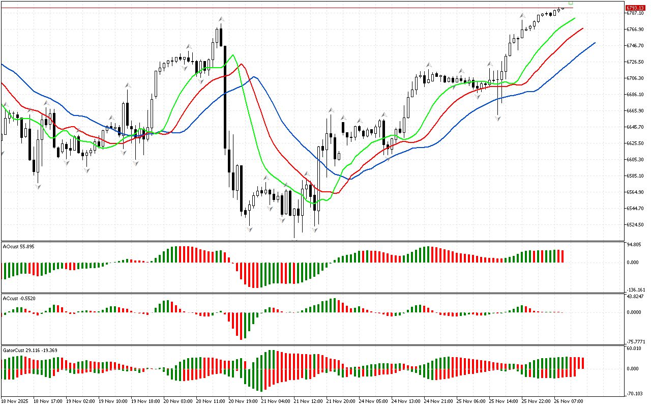 According to S&P 500, the phase space is defined as northern, since the price has risen above the upper fractal. Now we can examine signals from other market dimensions within the framework of Bill Williams’ strategy.