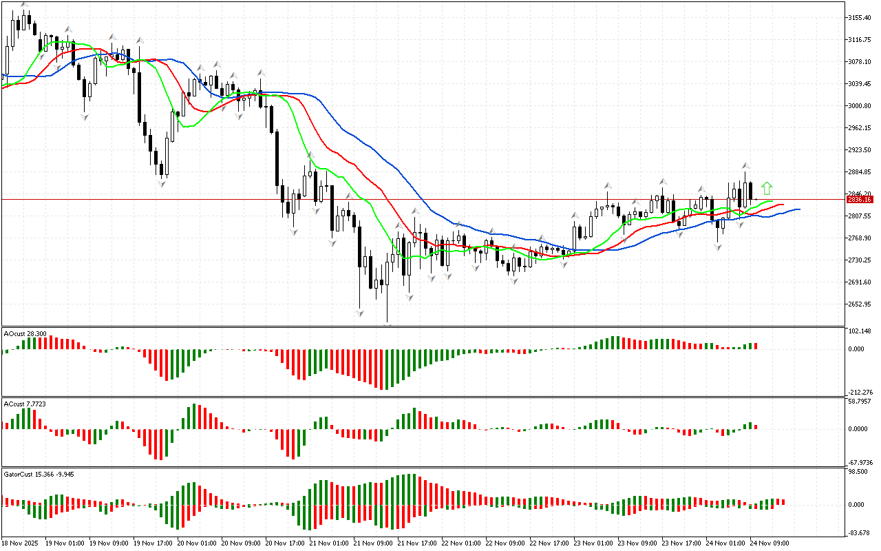Histogram indikator Gator belum membentuk sinyal yang jelas. Warna histogram berubah, yang menunjukkan perubahan fase pasar.