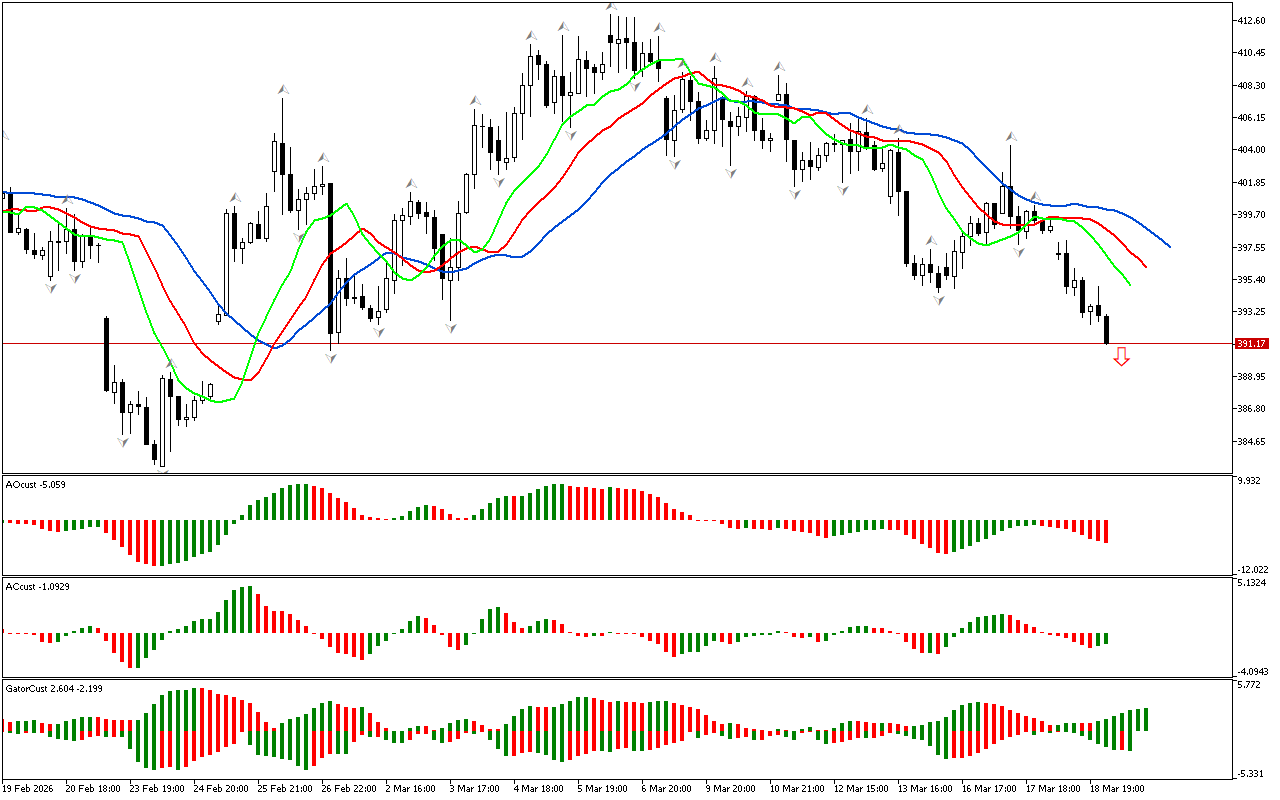 Gator インジケーターのヒストグラムはまだ明確なシグナルを形成していません。ヒストグラムの色が変化し、市場フェーズの変化を示します。
