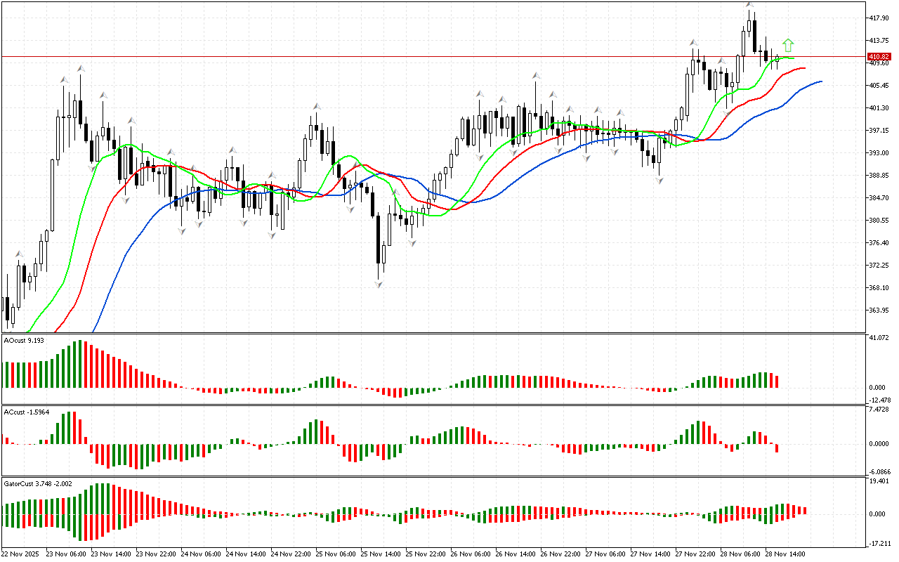 동시에 Awesome Oscillator 히스토그램은 현재 0선 위에 있습니다.