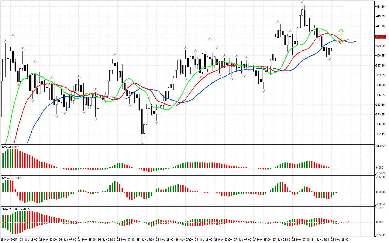 Gator 지표에 일련의 빨간색 막대가 그려집니다. 이 신호는 수정의 형성을 보여줍니다.