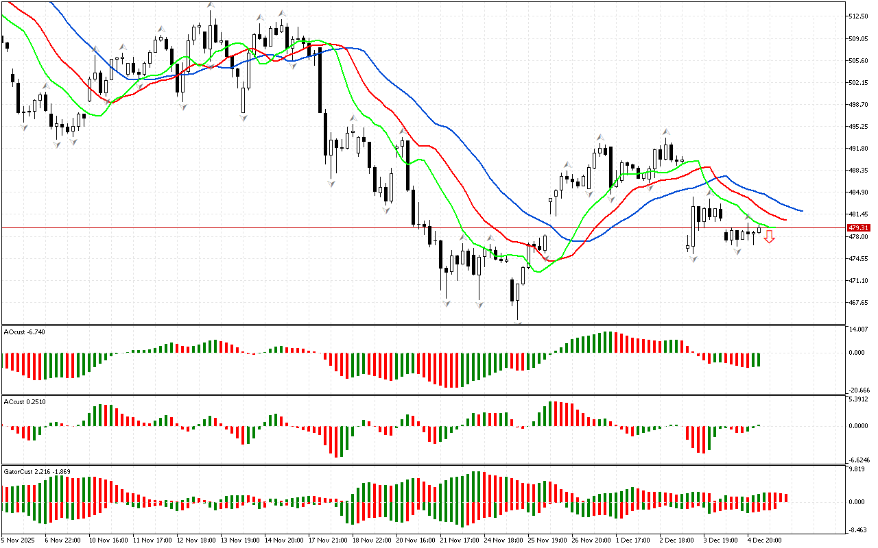Accelerator Oscillator 지표의 0 표시 위에 있는 녹색 막대는 하향 임펄스의 에너지가 감소했음을 보여줍니다. 그러나 가격이 Alligator의 빨간 선 아래에 머물러 있는 한 가격 하락이 예상됩니다.