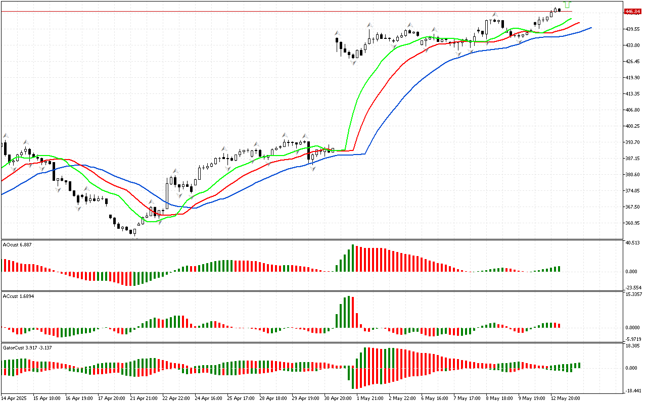동시에 Awesome Oscillator 히스토그램은 현재 0선 위에 있습니다.