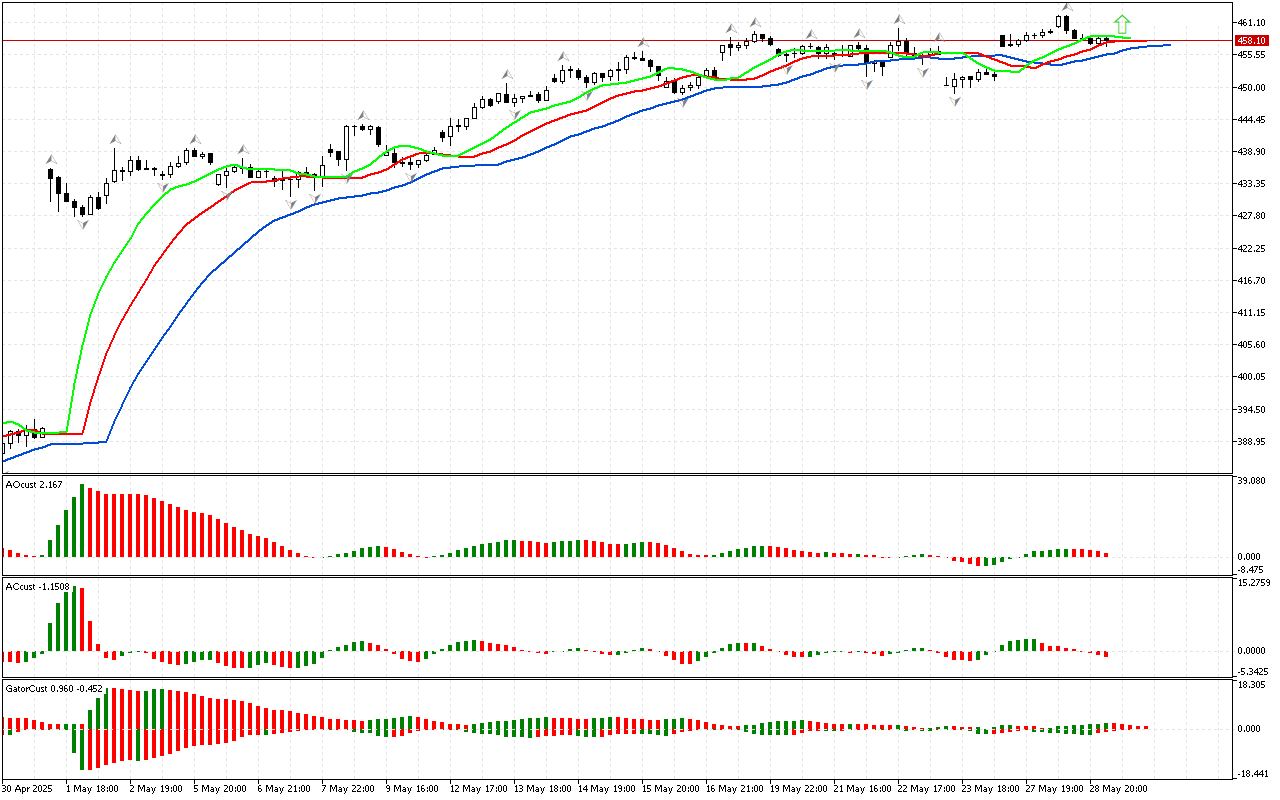 앨리게이터 지표는 시장의 긍정적인 분위기를 확인해줍니다. 앨리게이터의 입이 벌려져 있습니다. 배고프죠. 이런 배경에서 가격은 계속 상승할 수 있습니다.