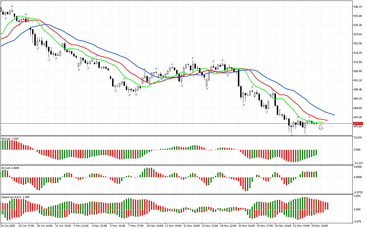 Seperti yang dilihat, penunjuk AC dan AO berwarna hijau. Terdapat tanda pembetulan terbentuk atau trend tempatan berubah. Kekuatan dan tenaga pergerakan menurun mengalami penurunan, tetapi harga kekal di bawah garis Alligator merah. Itulah sebabnya pergerakan ke bawah masih menjadi keutamaan.