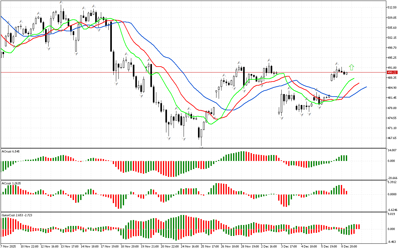 Penunjuk Alligator mengesahkan mood positif pasaran. Mulut Alligator ternganga. Ia lapar. Dengan latar belakang ini, harga mungkin terus meningkat.