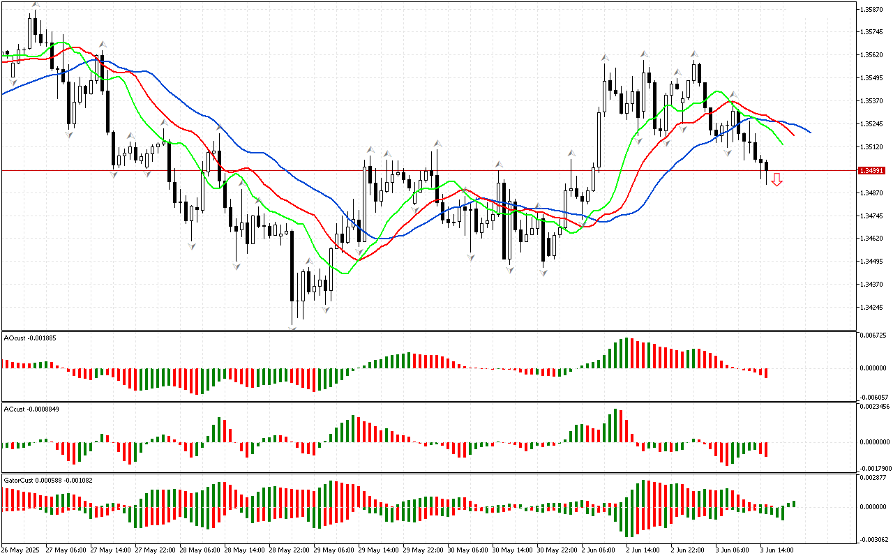 Histogram penunjuk Gator belum membentuk isyarat yang jelas lagi. Warna histogram berubah, menunjukkan perubahan dalam fasa pasaran.