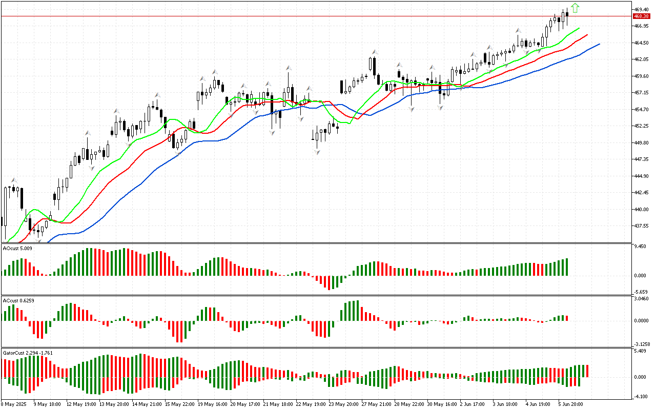 Penunjuk Alligator mengesahkan mood positif pasaran. Mulut Alligator ternganga. Ia lapar. Dengan latar belakang ini, harga mungkin terus meningkat.