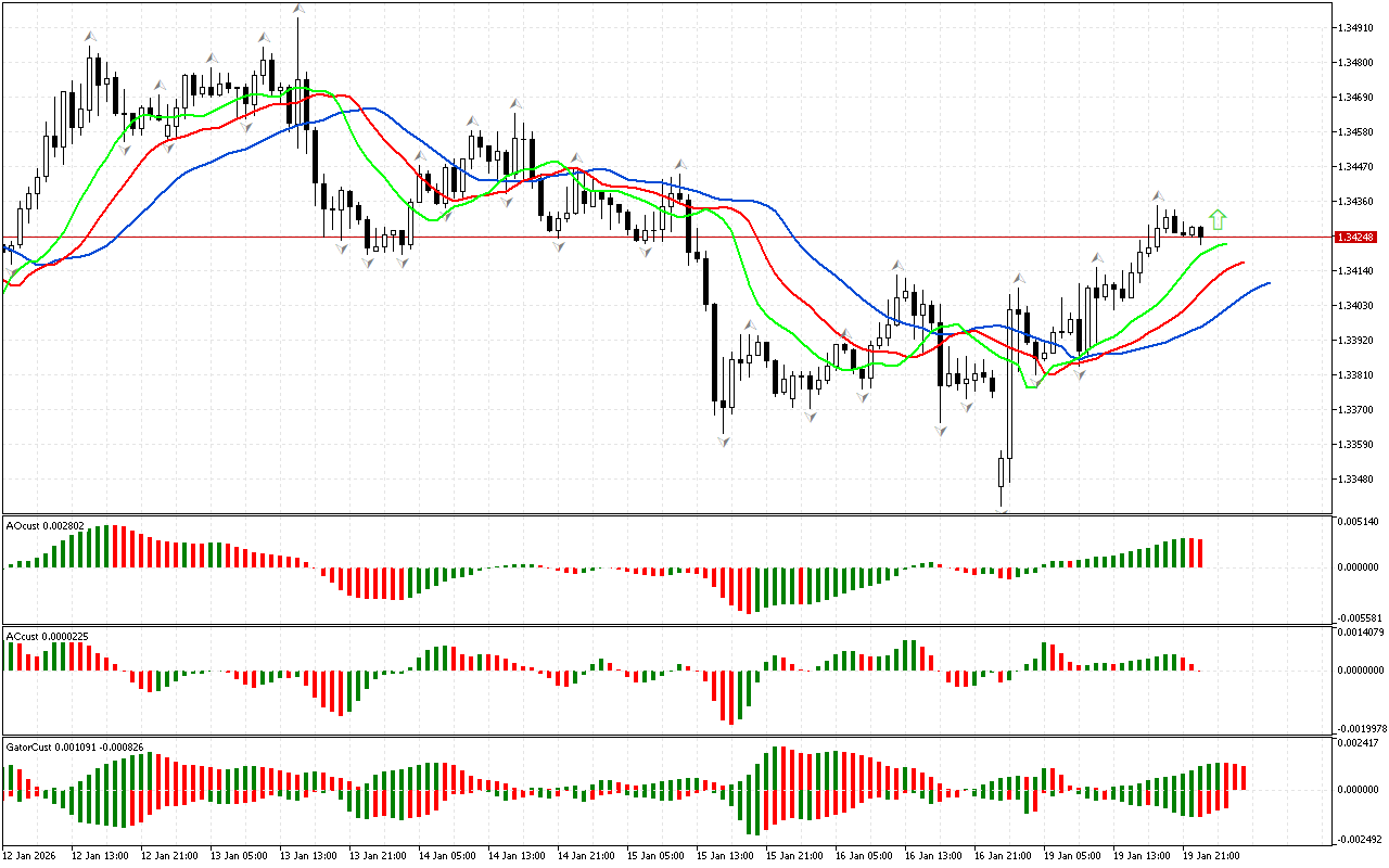Histogram penunjuk Gator belum membentuk isyarat yang jelas lagi. Warna histogram berubah, menunjukkan perubahan dalam fasa pasaran.
