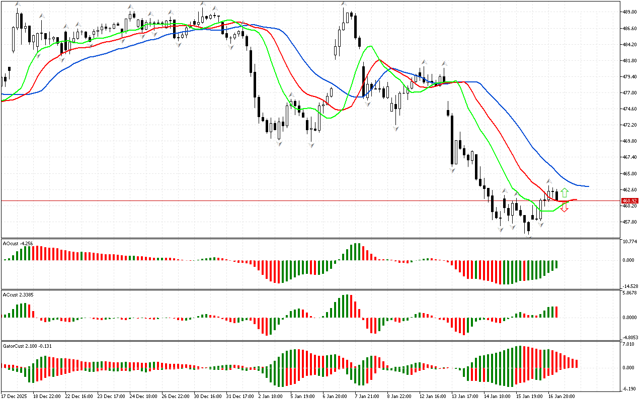 Histogram penunjuk Gator belum membentuk isyarat yang jelas lagi. Warna histogram berubah, menunjukkan perubahan dalam fasa pasaran.