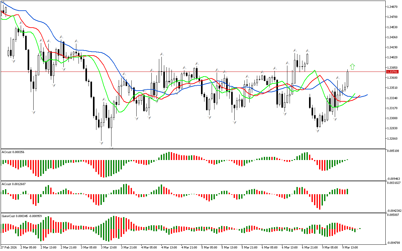 Histogram penunjuk Gator belum membentuk isyarat yang jelas lagi. Warna histogram berubah, menunjukkan perubahan dalam fasa pasaran.