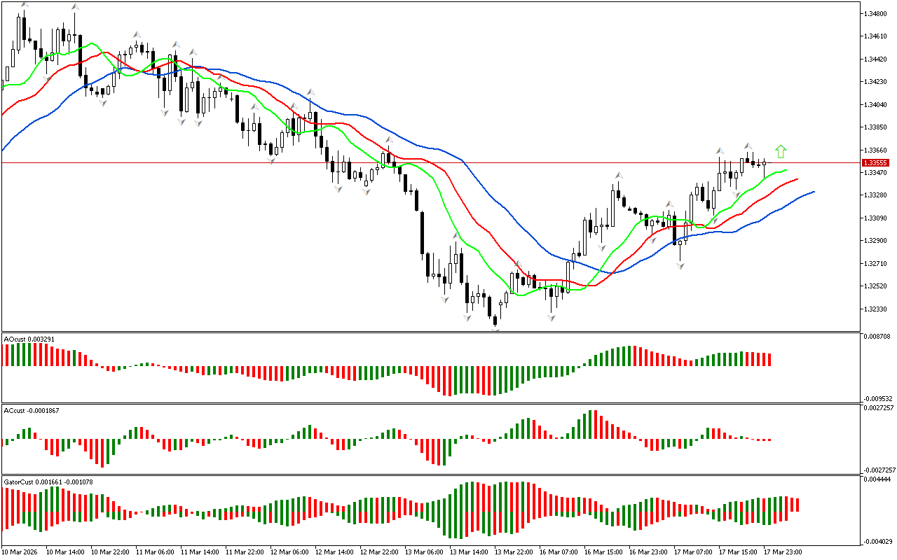 Pada masa yang sama, penunjuk AC dan AO bertukar merah. Ini menandakan bahawa kekuatan dan tenaga impuls ke atas mempunyai nyahpecutan. Ini boleh membawa kepada pembangunan pembetulan yang lebih mendalam atau perubahan arah aliran. Walau bagaimanapun, senario pergerakan utara lazimnya kekal selagi harga kekal di atas garisan Alligator merah.