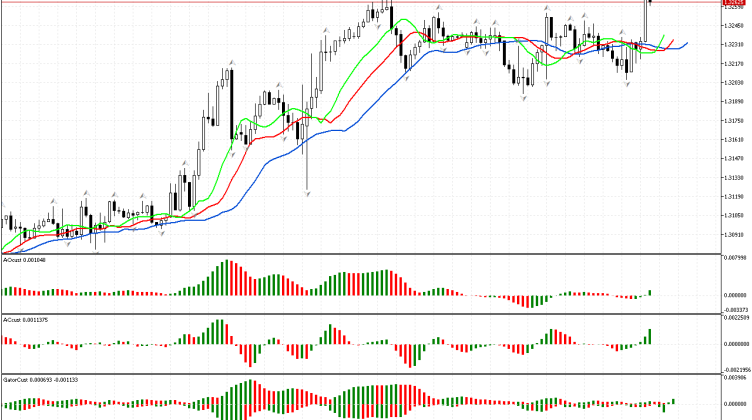 На графике выбит верхний фрактал, расположенный над пастью Аллигатора. Благодаря этому сигналу мы определяем пространство фазы как северное и можем рассматривать следующие 3 измерения рынка. Серия зеленых столбцов наблюдается на…