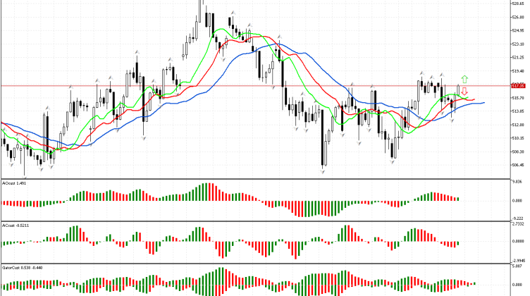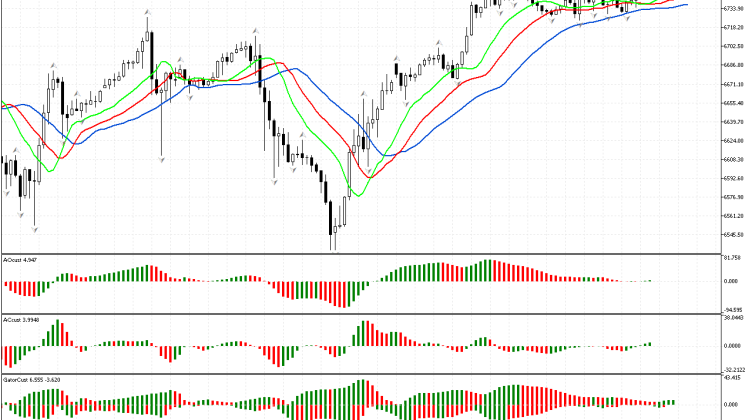 По S&P 500 пространство фазы определено как северное, так как выбит фрактал на покупку. Теперь мы можем рассматривать сигналы других измерений рынка в рамках стратегии Билла Вильямса.Линии Аллигатора также выстроились…