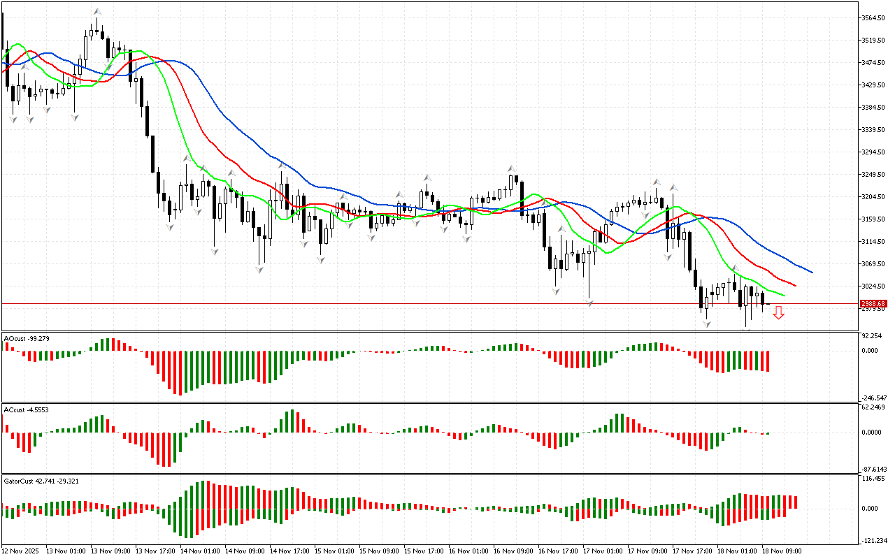Индикаторы AC и AO находятся в красной зоне, что говорит о наличии силы и энергии для продолжения движения вниз.