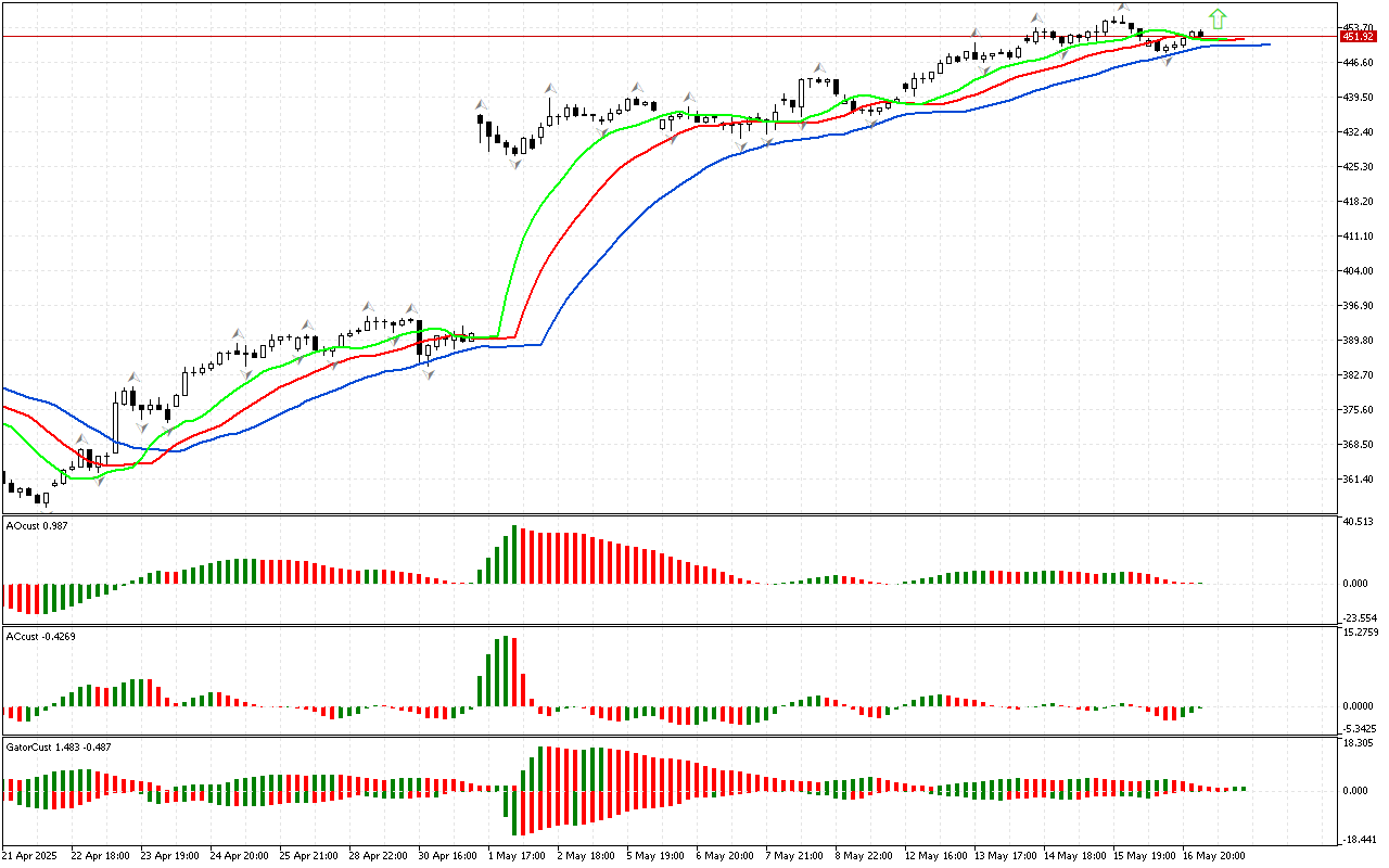 При этом гистограмма Awesome Oscillator на текущий момент находятся выше нулевой линии.