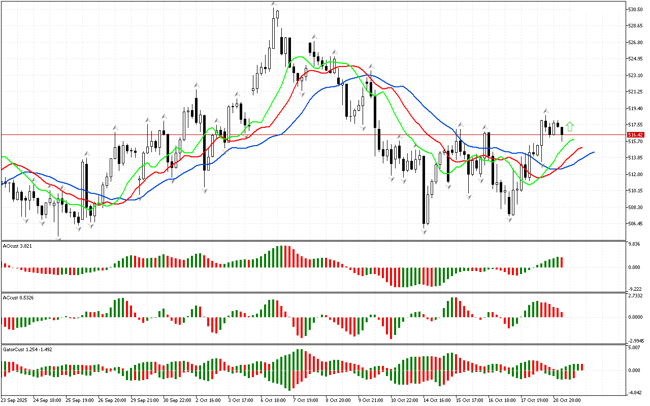 แถบสีแดงที่อยู่เหนือเครื่องหมายศูนย์บนตัวบ่งชี้ Accelerator Oscillator แสดงถึงการลดลงของพลังงานในการเคลื่อนไหวขาขึ้น อย่างไรก็ตาม ตราบใดที่ราคายังคงอยู่เหนือเส้นสีแดงของ Alligator ก็คาดว่าจะมีการเติบโตของราคา