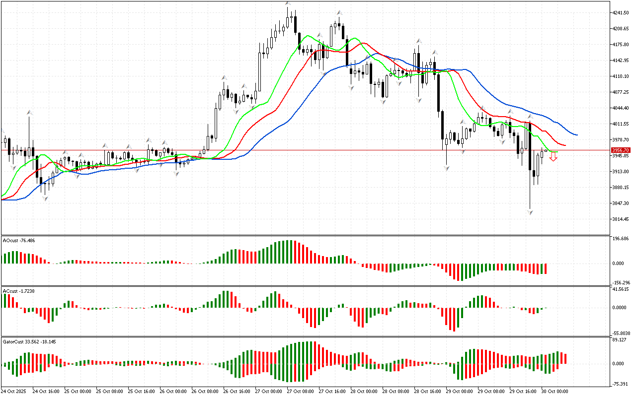 Ang mga berdeng bar na matatagpuan sa itaas ng zero mark sa indicator ng Accelerator Oscillator ay nagpapakita ng pagbaba sa enerhiya ng pababang impulse. Gayunpaman, hangga’t ang presyo ay nananatili sa ibaba ng pulang linya ng Alligator, ang pagbaba ng presyo ay inaasahan.