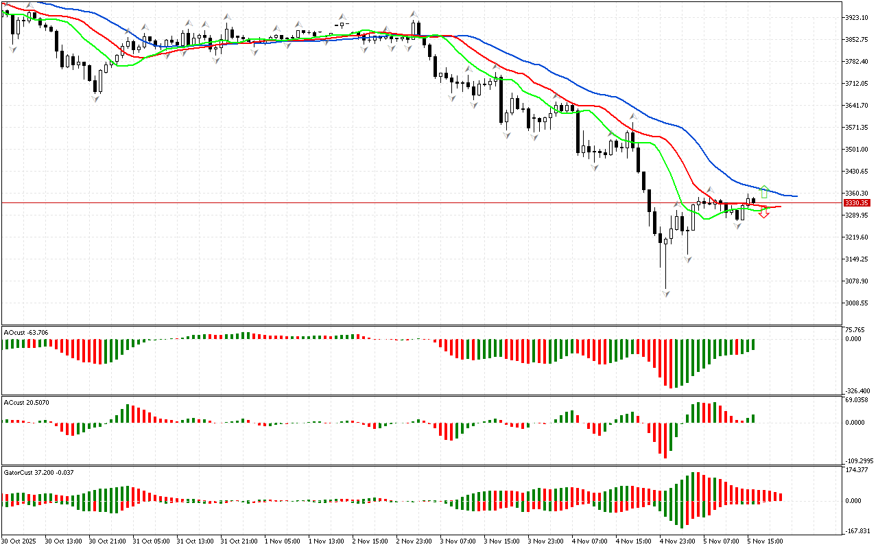 Ang kulay ng histograms ng Gator indicator ay nagbabago, kaya ang indicator na ito ay hindi pa nakakabuo ng malinaw na signal.