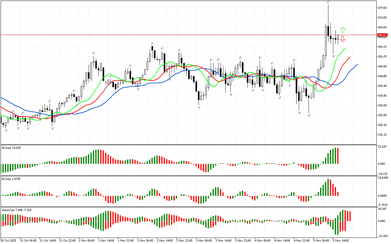 Ang histogram ng Gator indicator ay hindi pa nakakabuo ng malinaw na signal. Ang kulay ng mga histogram ay nagbabago, na nagpapahiwatig ng pagbabago sa yugto ng merkado.