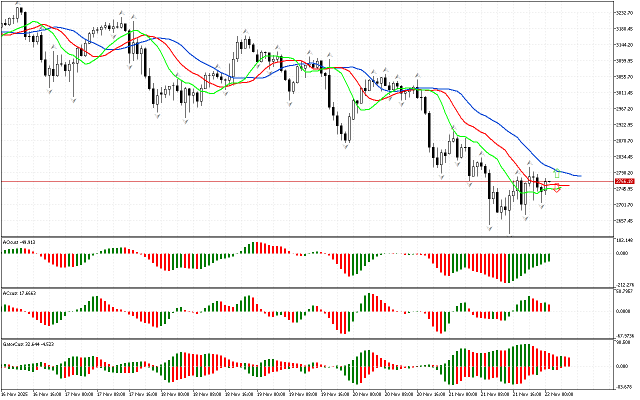 Ang histogram ng Gator indicator ay hindi pa nakakabuo ng malinaw na signal. Ang kulay ng mga histogram ay nagbabago, na nagpapahiwatig ng pagbabago sa yugto ng merkado.