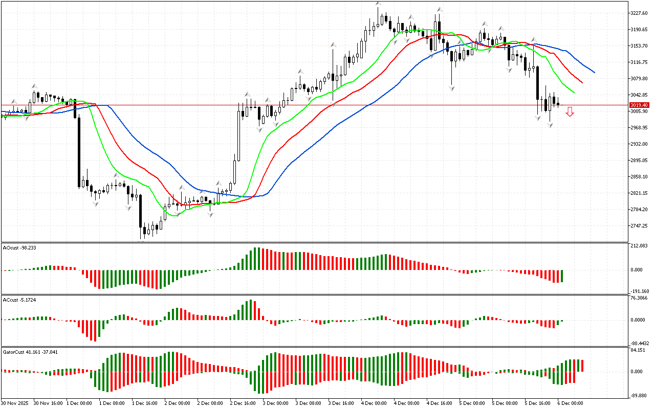 Ang histogram ng Gator indicator ay hindi pa nakakabuo ng malinaw na signal. Ang kulay ng mga histogram ay nagbabago, na nagpapahiwatig ng pagbabago sa yugto ng merkado.
