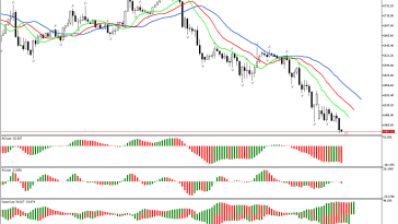 Ang pagsusuri ng kasalukuyang sitwasyon sa merkado ay nagpapakita na ang phase space ay tinukoy bilang timog. Ang presyo ay bumagsak sa ibaba ng mas mababang fractal. Ito ay maaaring magpahiwatig ng simula ng isang pababang paggalaw. Upang makakuha ng impormasyon tungkol sa lakas at lakas ng kilusang ito, bigyang-pansin natin ang mga posisyon ng iba pang mga tagapagpahiwatig sa tsart.