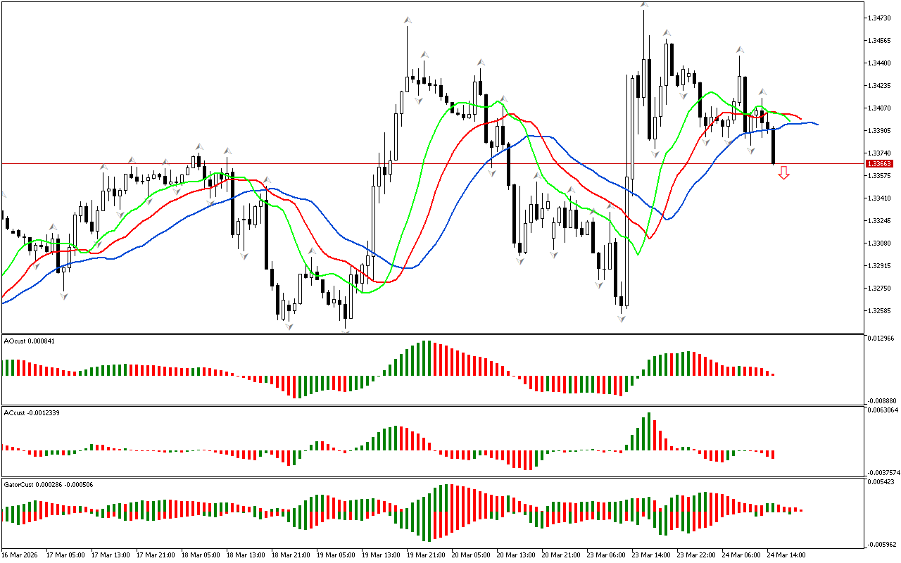 Ang histogram ng Gator indicator ay hindi pa nakakabuo ng malinaw na signal. Ang kulay ng mga histogram ay nagbabago, na nagpapahiwatig ng pagbabago sa yugto ng merkado.