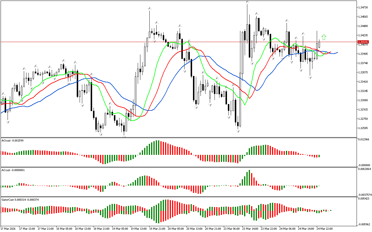 Ang histogram ng Gator indicator ay hindi pa nakakabuo ng malinaw na signal. Ang kulay ng mga histogram ay nagbabago, na nagpapahiwatig ng pagbabago sa yugto ng merkado.