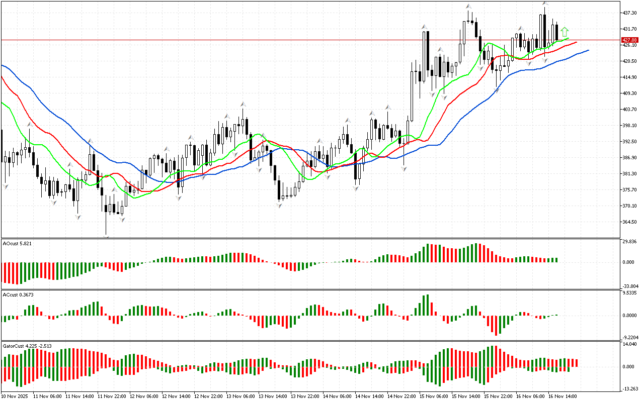 Chỉ báo Alligator xác nhận tâm lý thị trường tích cực. Miệng Cá Sấu đang mở. Điều này cho thấy giá có thể tiếp tục tăng.