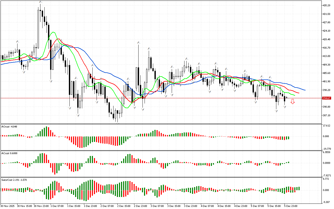 Các thanh tín hiệu mới nhất trên biểu đồ AC và AO có màu xanh lá. Các chỉ báo cho thấy sức mạnh và năng lượng của xung lực giảm đang suy yếu. Điều này có thể là tín hiệu đảo chiều xu hướng cục bộ hoặc sự phát triển của một đợt điều chỉnh. Tuy nhiên, khi giá vẫn nằm dưới chỉ báo Alligator (Cá Sấu), xu hướng giảm vẫn chiếm ưu thế.